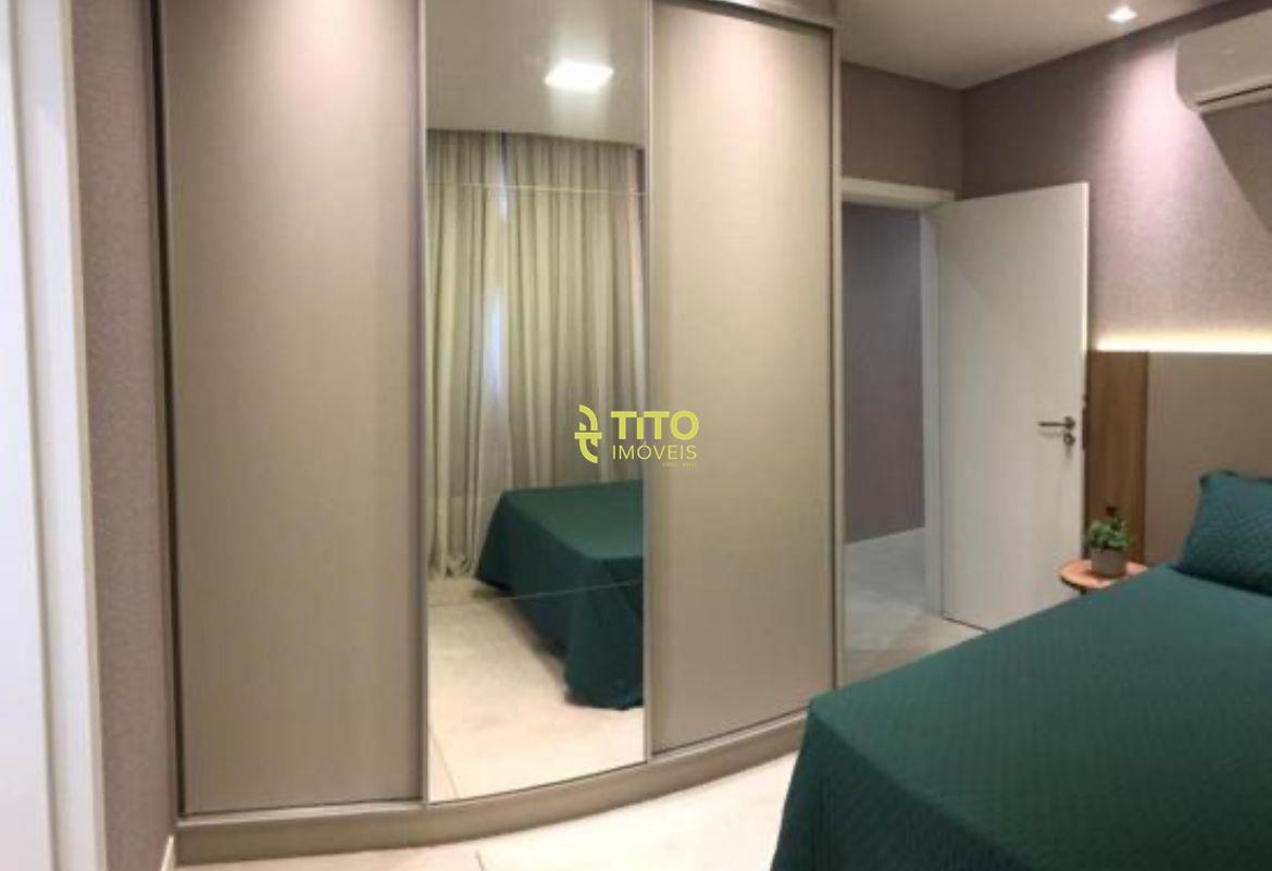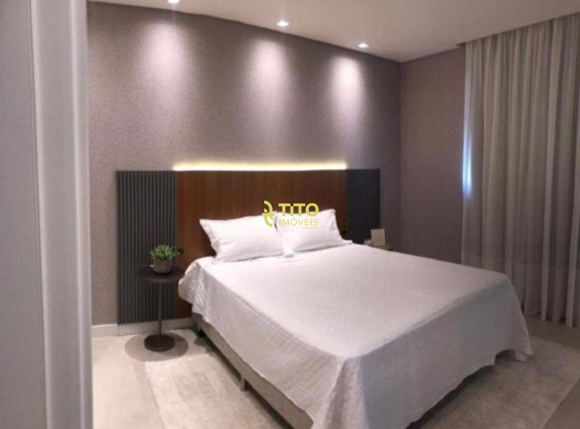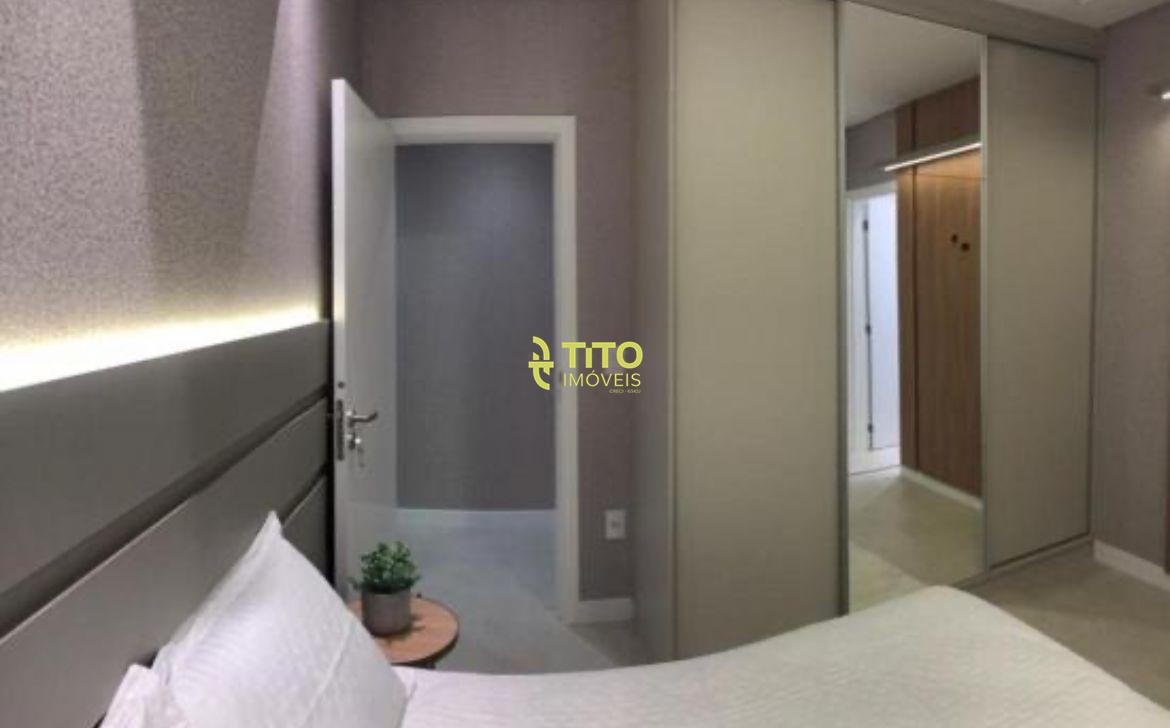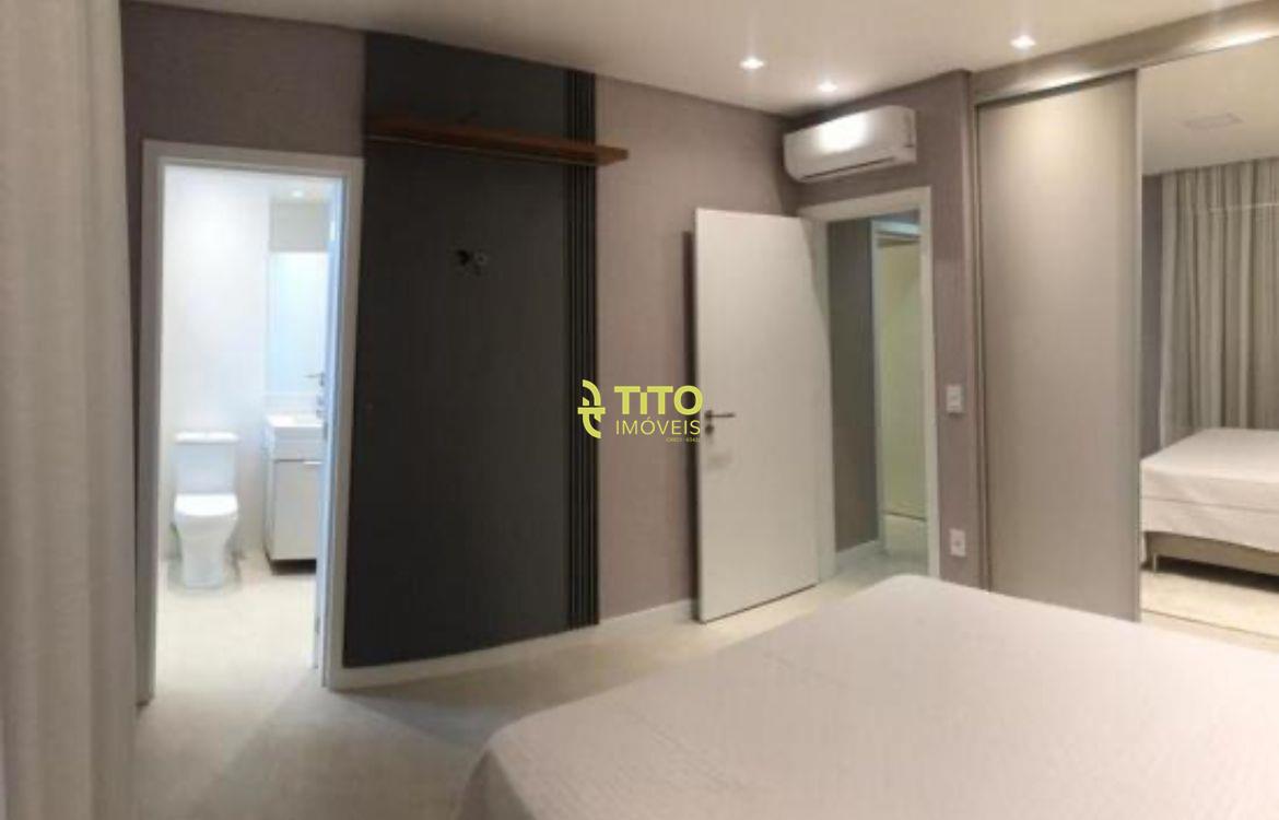 Apartamento mobiliado medindo 124m², contendo cozinha, sala, 4 banheiros, 3 suítes, área de serviço, sacada com churrasqueira e 2 vagas de garagem.