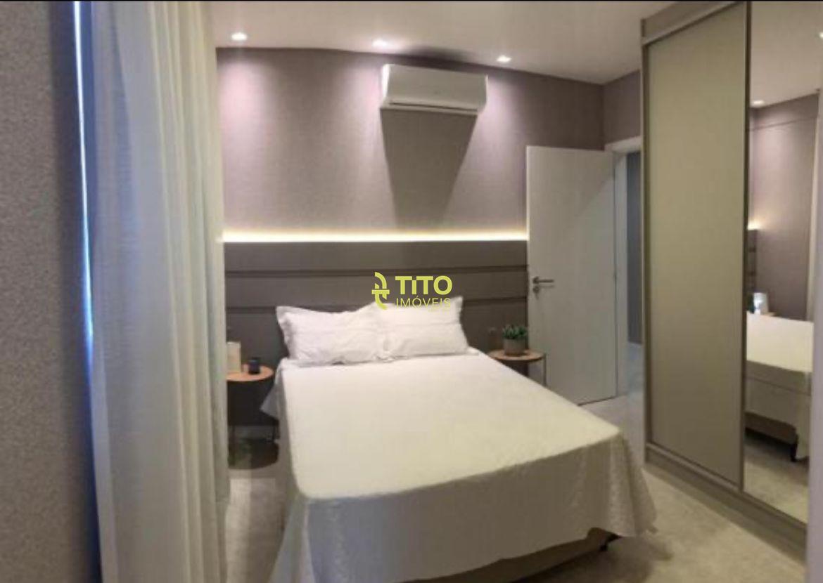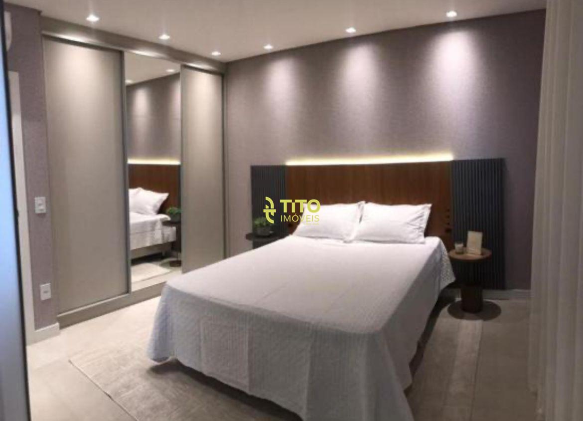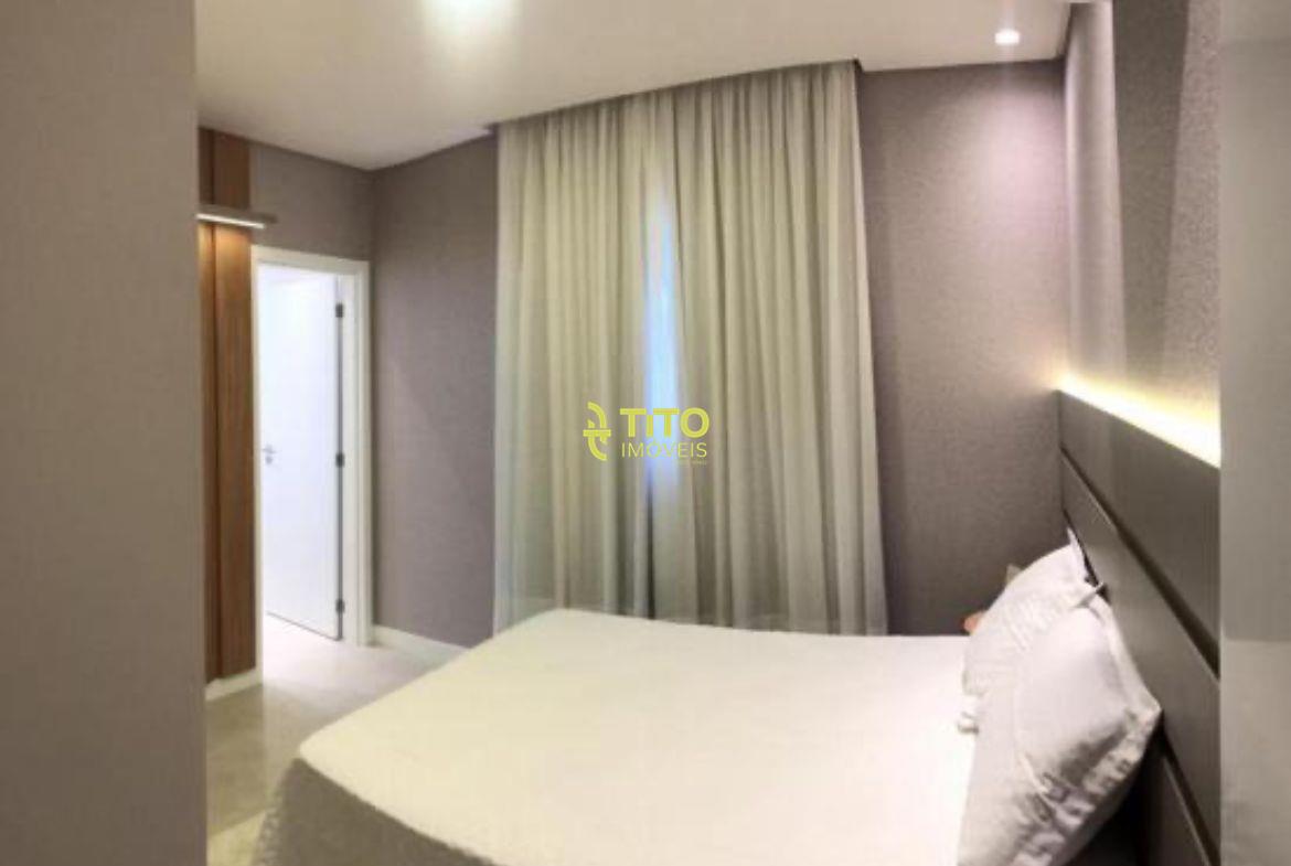 Apartamento mobiliado medindo 124m², contendo cozinha, sala, 4 banheiros, 3 suítes, área de serviço, sacada com churrasqueira e 2 vagas de garagem.